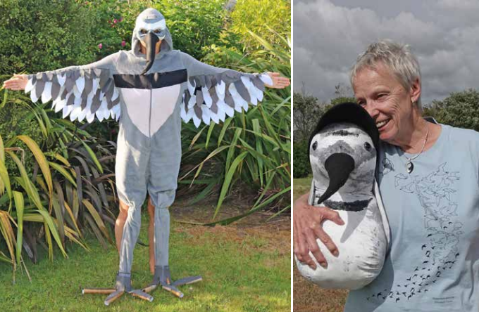 an aid to telling school pupils about these amazing birds; Ann Buckmaster wears one of the Year of the Wrybill shirts